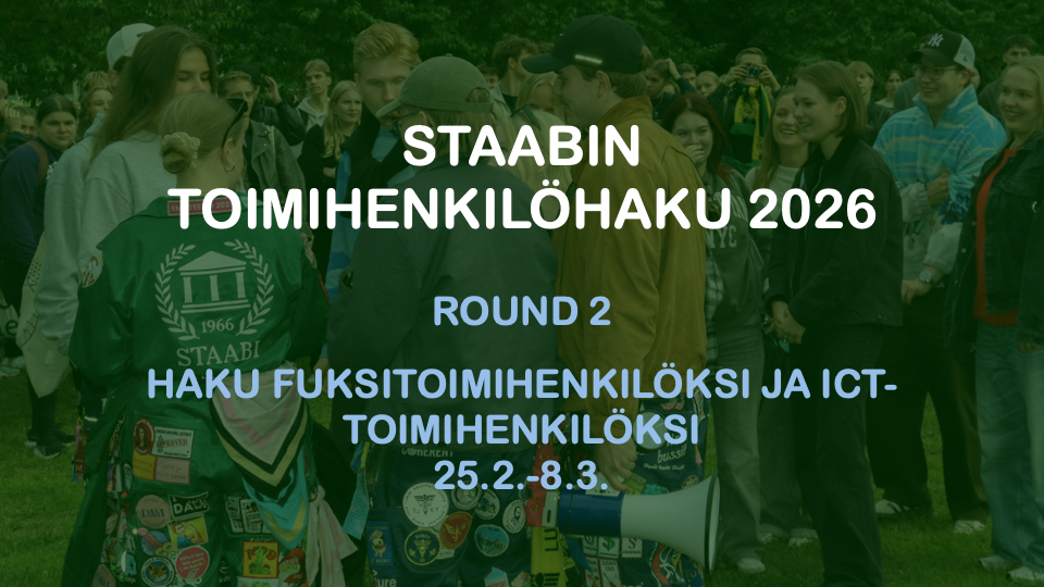 MITÄ: Haemme fuksitoimihenkilöä tuutorvastaavan oikeaksi kädeksi, sekä ICT-toimihenkilöä viestintävastaavan tueksi Staabin verkkosivujen päivittämisessä