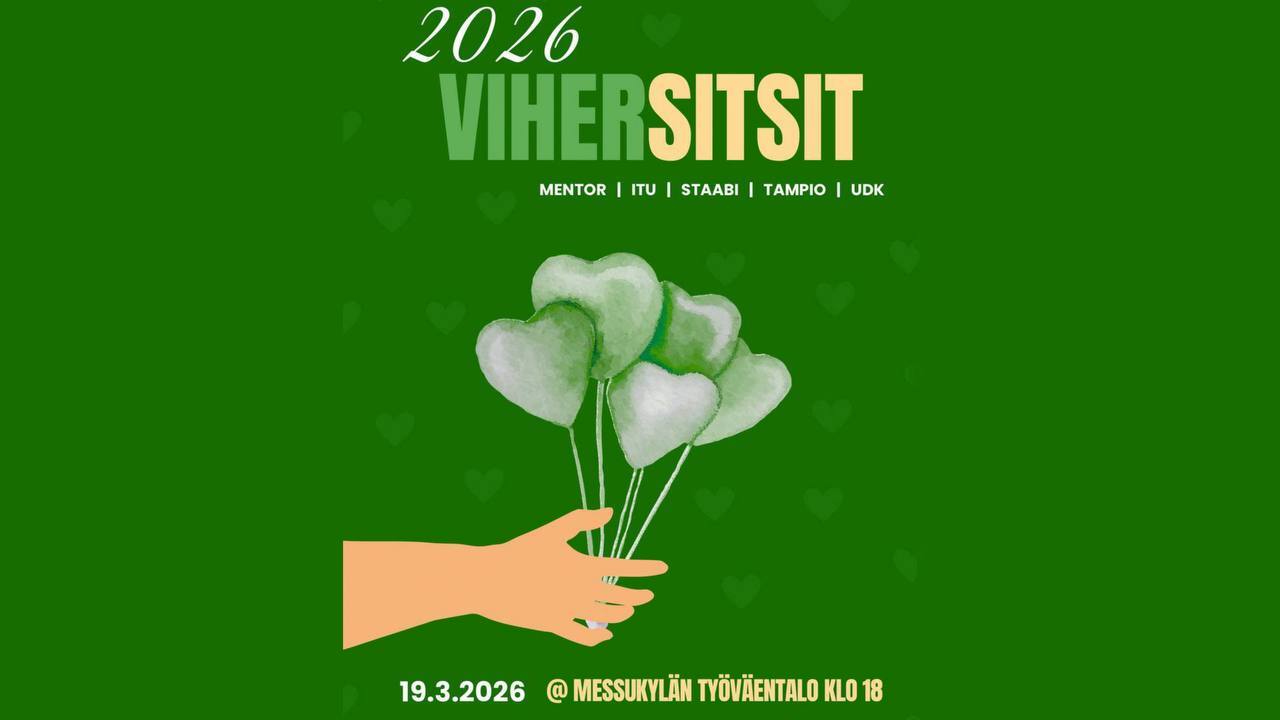 In English belowMITÄ: Poikkitieteelliset VihersitsitMISSÄ: Messukylän työväentaloMILLOIN: 19.3.2026 klo 18-22MITÄ PÄÄLLE: Vihreää vaatetusta + haalarit!MYYNTI: 3.3. klo 12 KideappissaJATKOT: Kannustamme osallistujia ostamaan Kolmiolipun!Vihersitsit tulevat taas! <3On aika jälleen sitsata yhdessä vihreähaalaristen ITUn, Mentorin, Tampion ja UDKn kanssa 19.3. klo: 18-22 Messukylän työväentalolla. Lipun hinta on 11 euroa ja ne tulevat myyntiin 3.3. klo 12. Kide.apissa. Laita siis päälle nuo kauniit vihreät haalarisi ja tule nauttimaan poikkitieteellisestä sitsiseurasta!